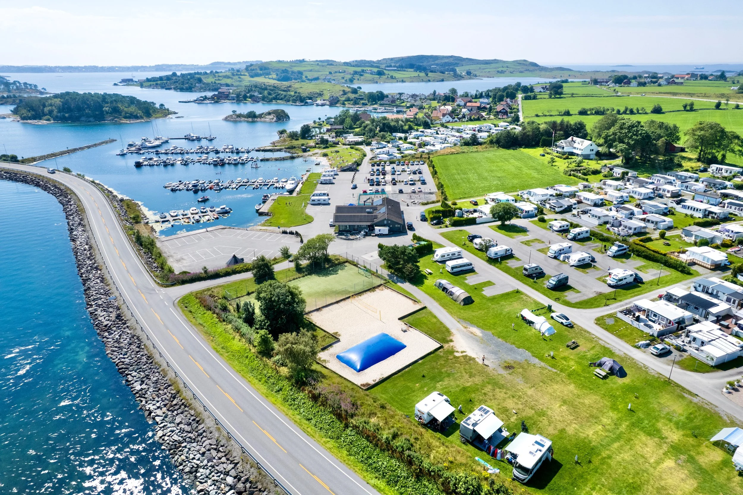 Hos oss finner dere flotte områder enten dere kommer med bobil, campingvogn, telt eller båt. Vi er stolte av å være en familievennlig campingplass hvor både store og små trives. Barna kan boltre seg på sandstranden, suse ned vannsklien eller leke på den store hoppeputen.